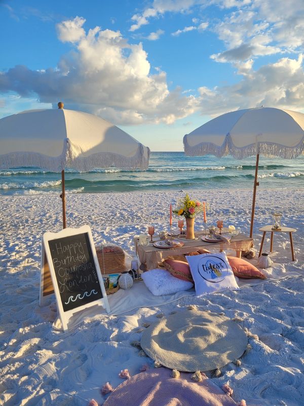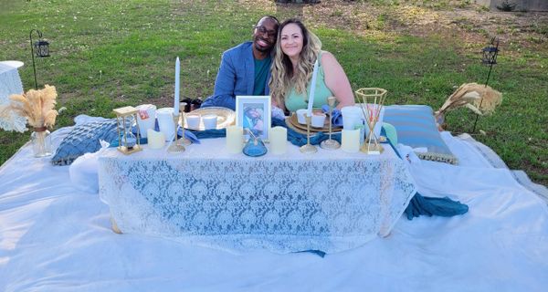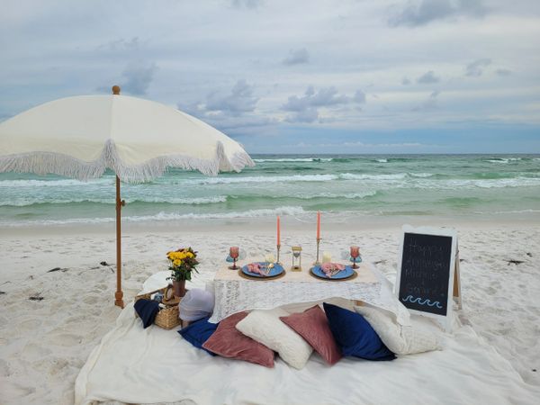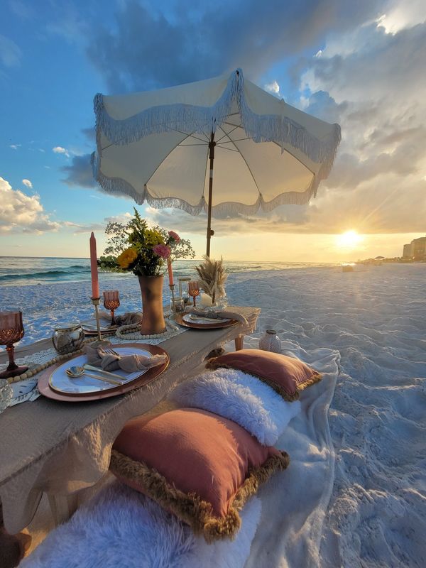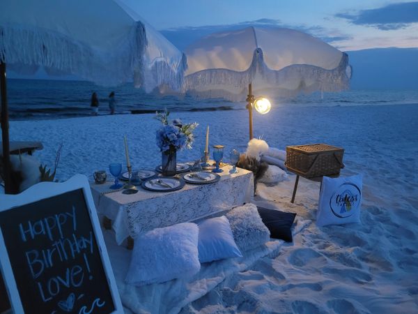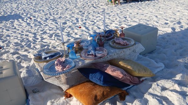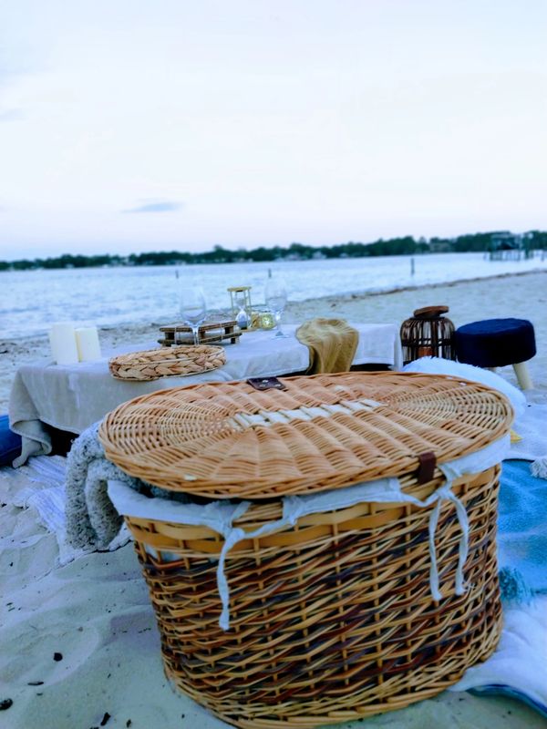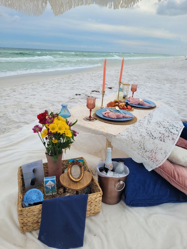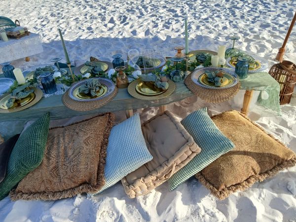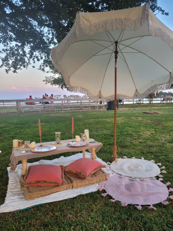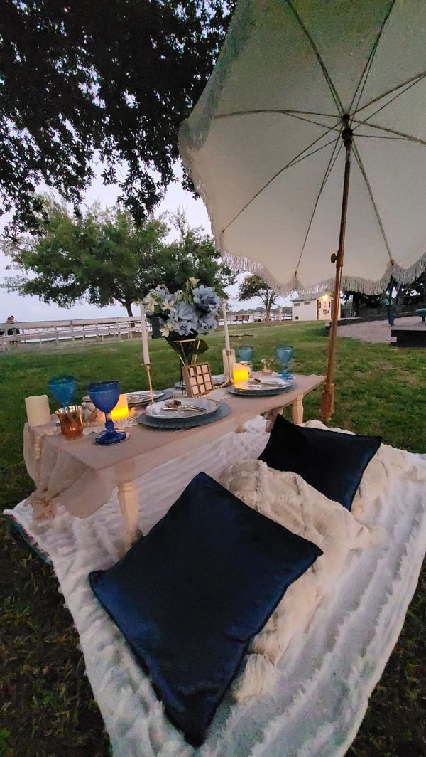 Picnic packages come standard with a blanket assortment, pillows, florals, dining setting: plates, napkins, silverware, drinkware, table decor, candles, personalized message board, ice bucket, complimentary sparkling or flat water, and setup and cleanup.