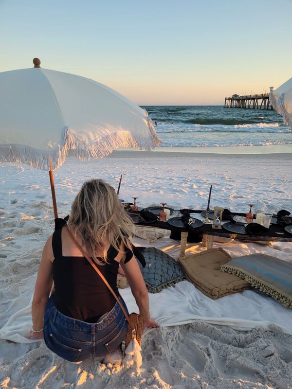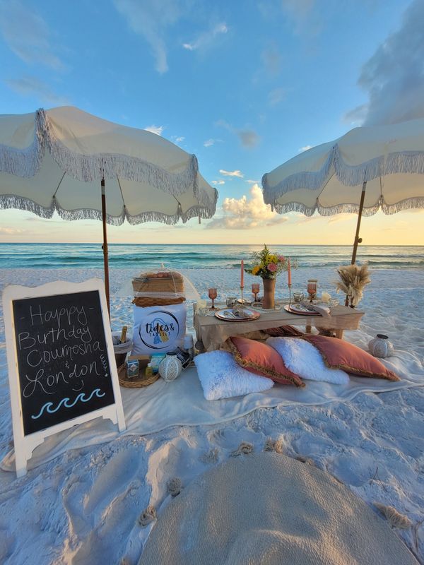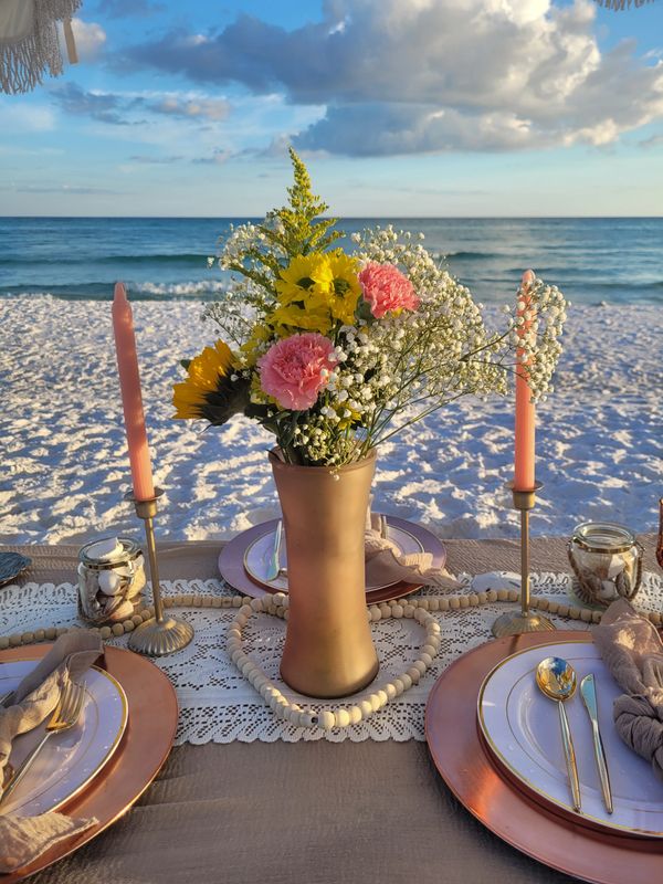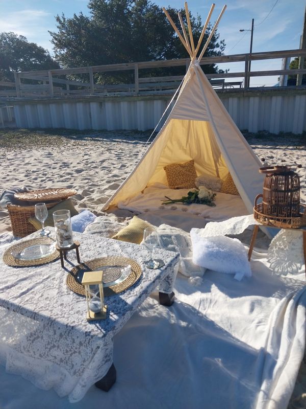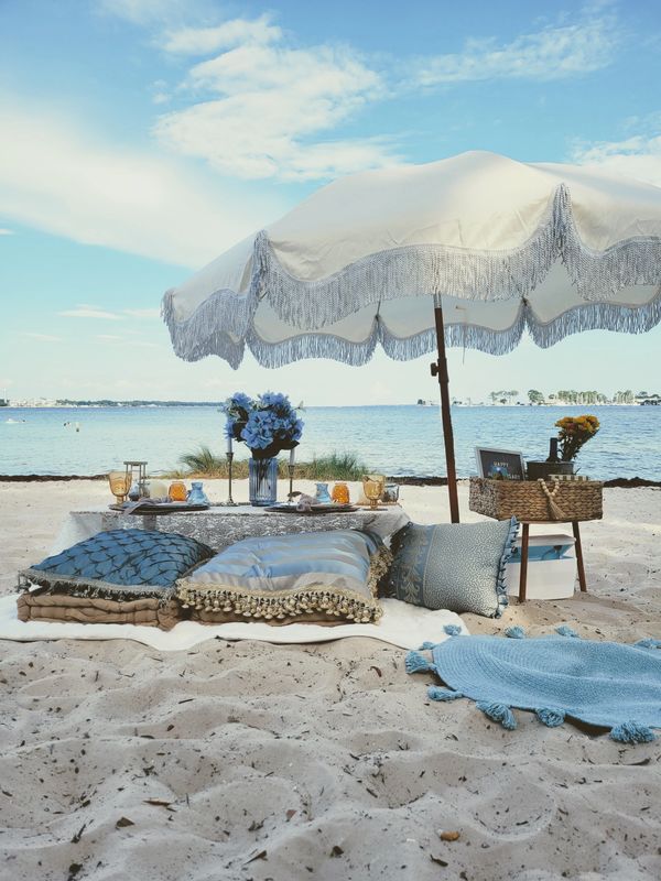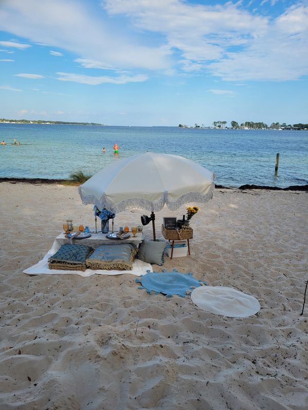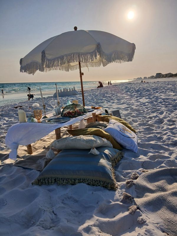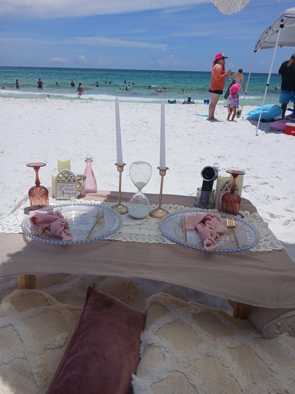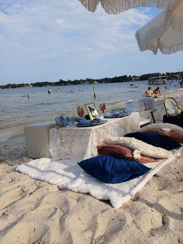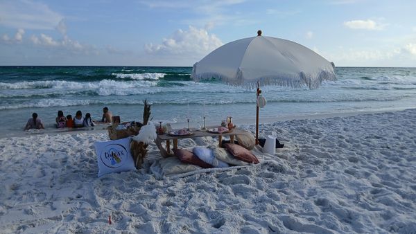 Picnic packages come standard with a blanket assortment, pillows, florals, dining setting: plates, napkins, silverware, drinkware, table decor, candles, personalized message board, ice bucket, complimentary sparkling or flat water, and setup and cleanup.