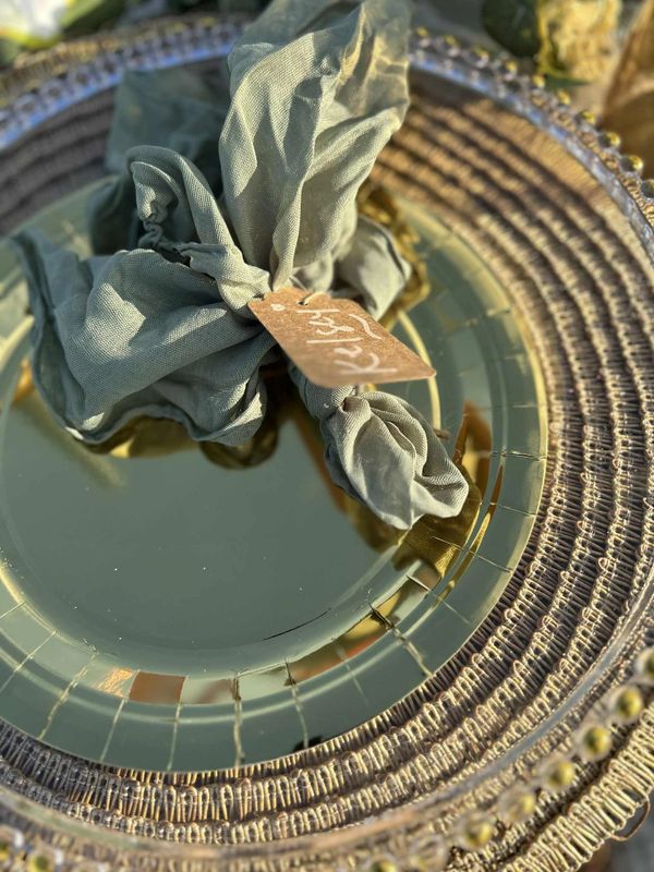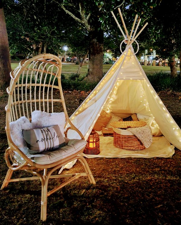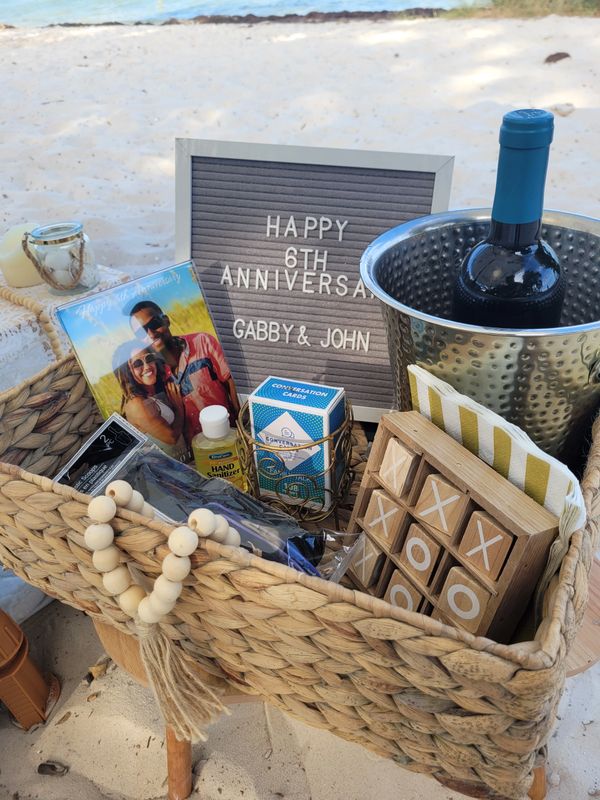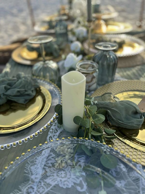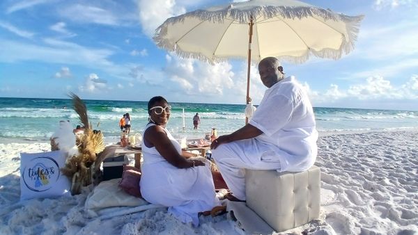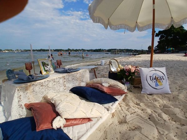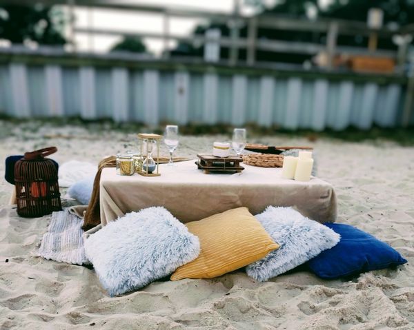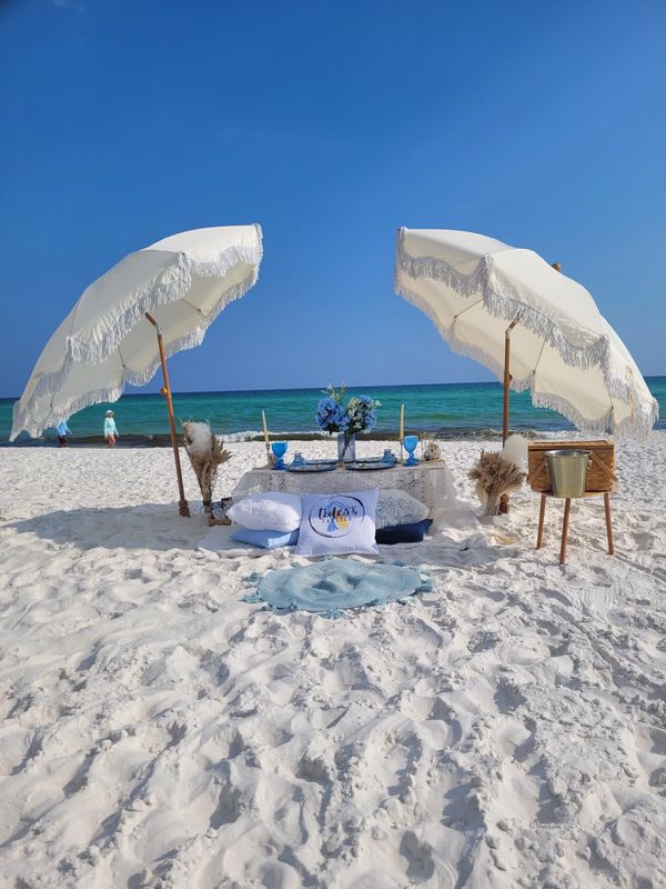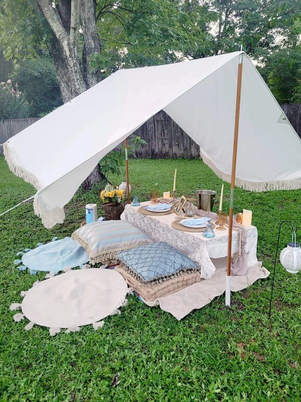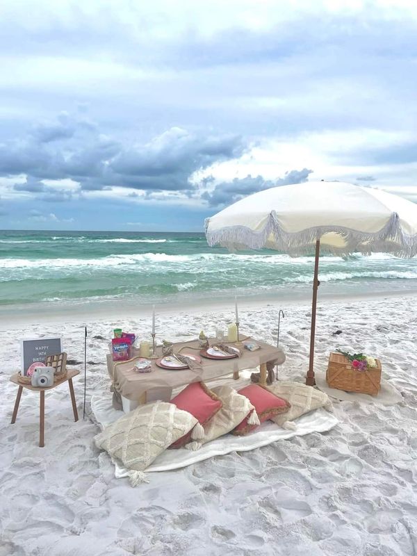 Picnic packages come standard with a blanket assortment, pillows, florals, dining setting: plates, napkins, silverware, drinkware, table decor, candles, personalized message board, ice bucket, complimentary sparkling or flat water, and setup and cleanup.